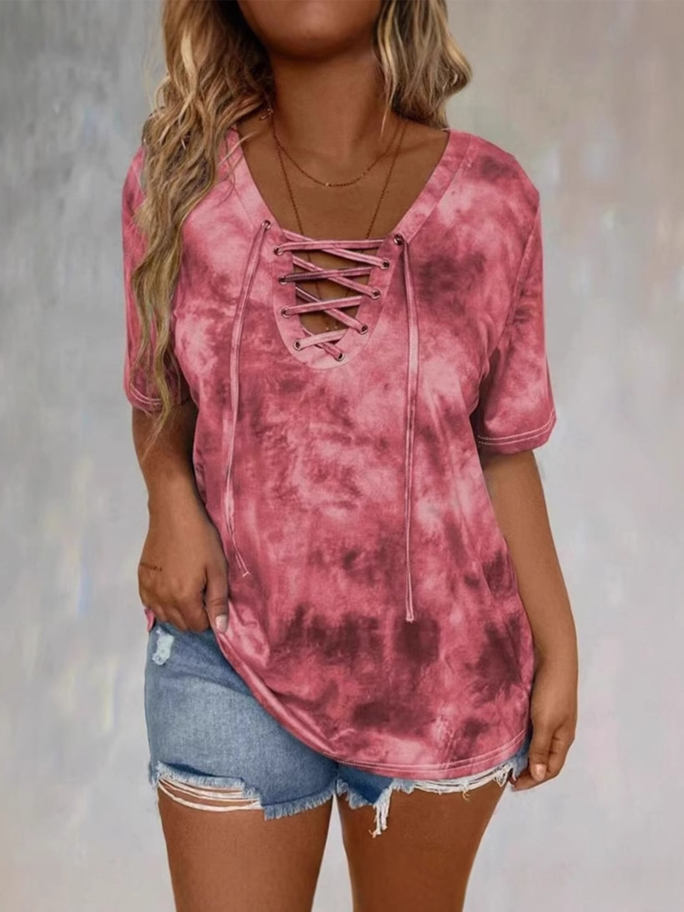 Tie Dye Lace-Up V-Neck Casual T-Shirt