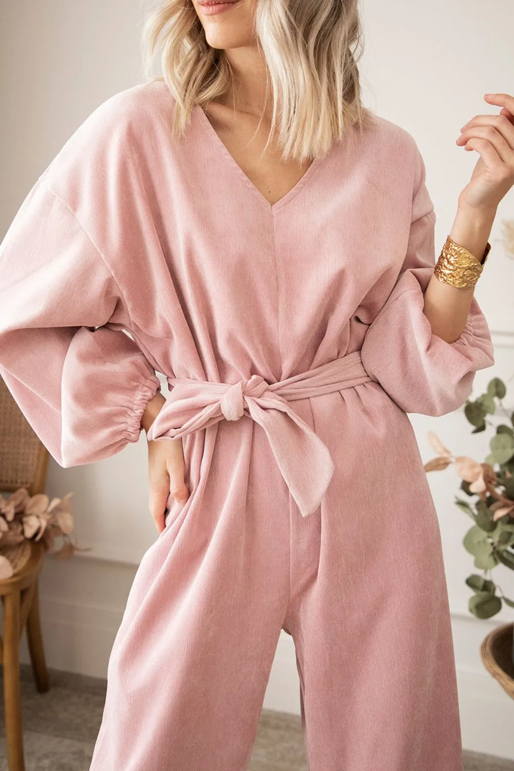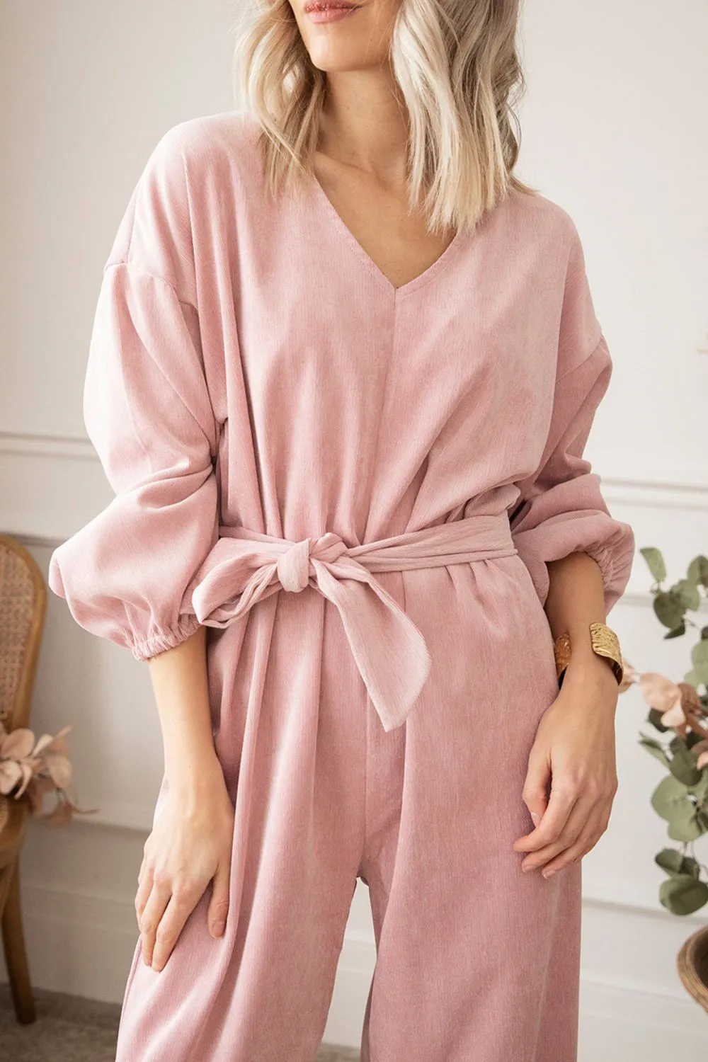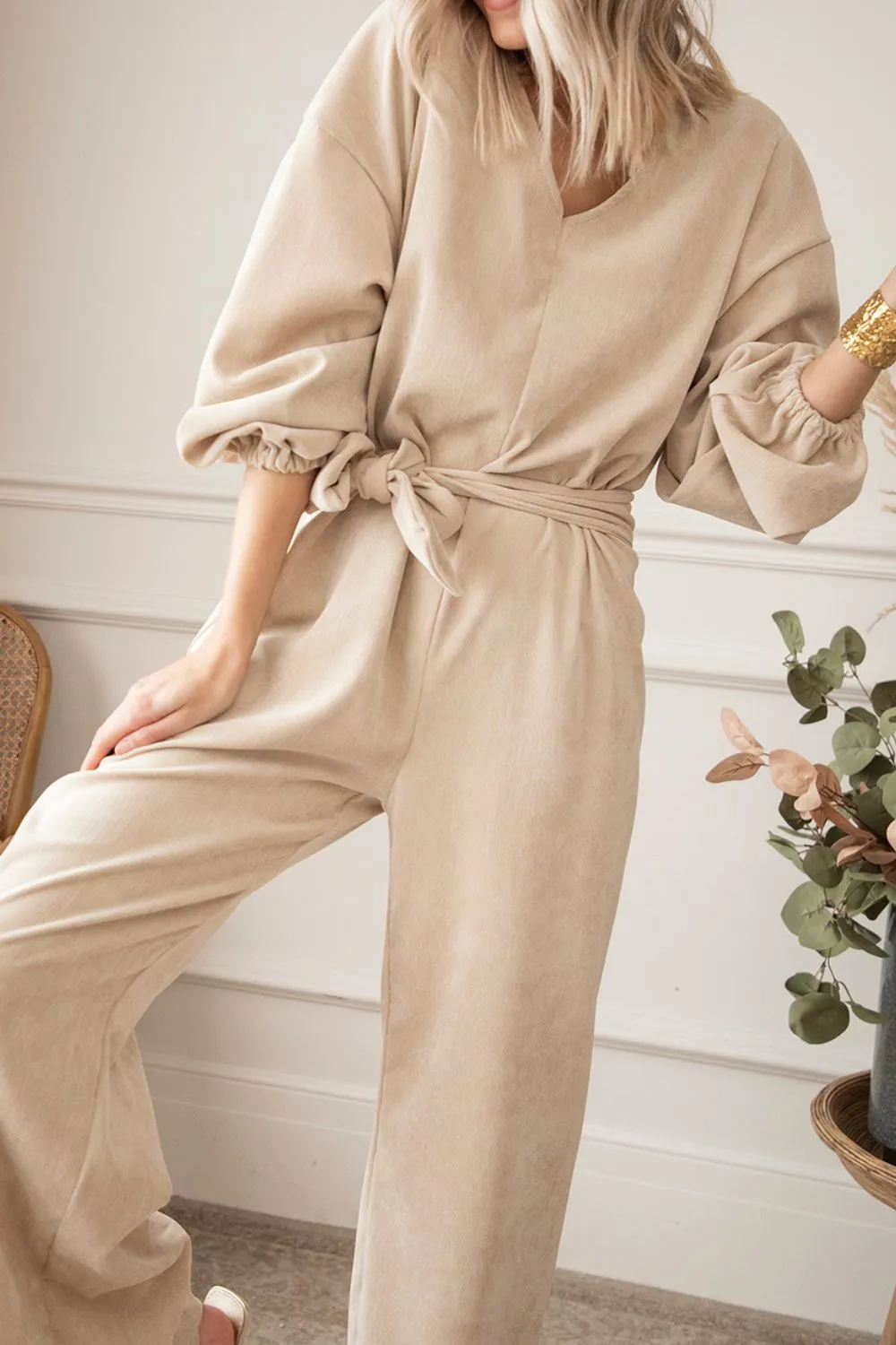 V-Neck Balloon Sleeve Wide Leg Jumpsuit