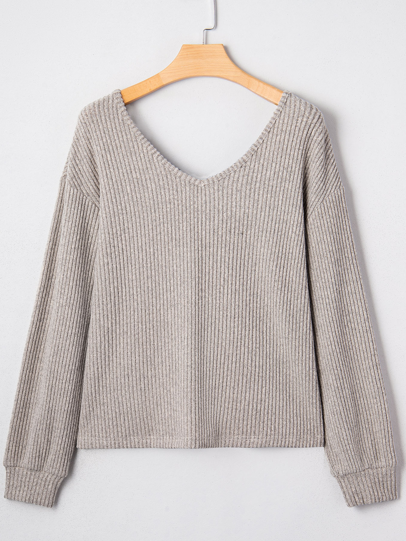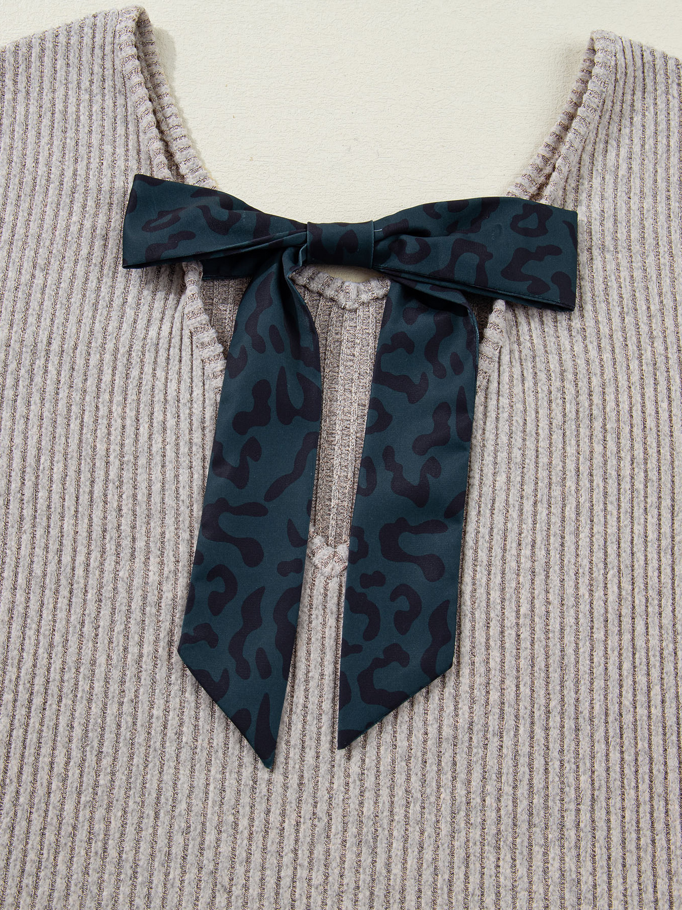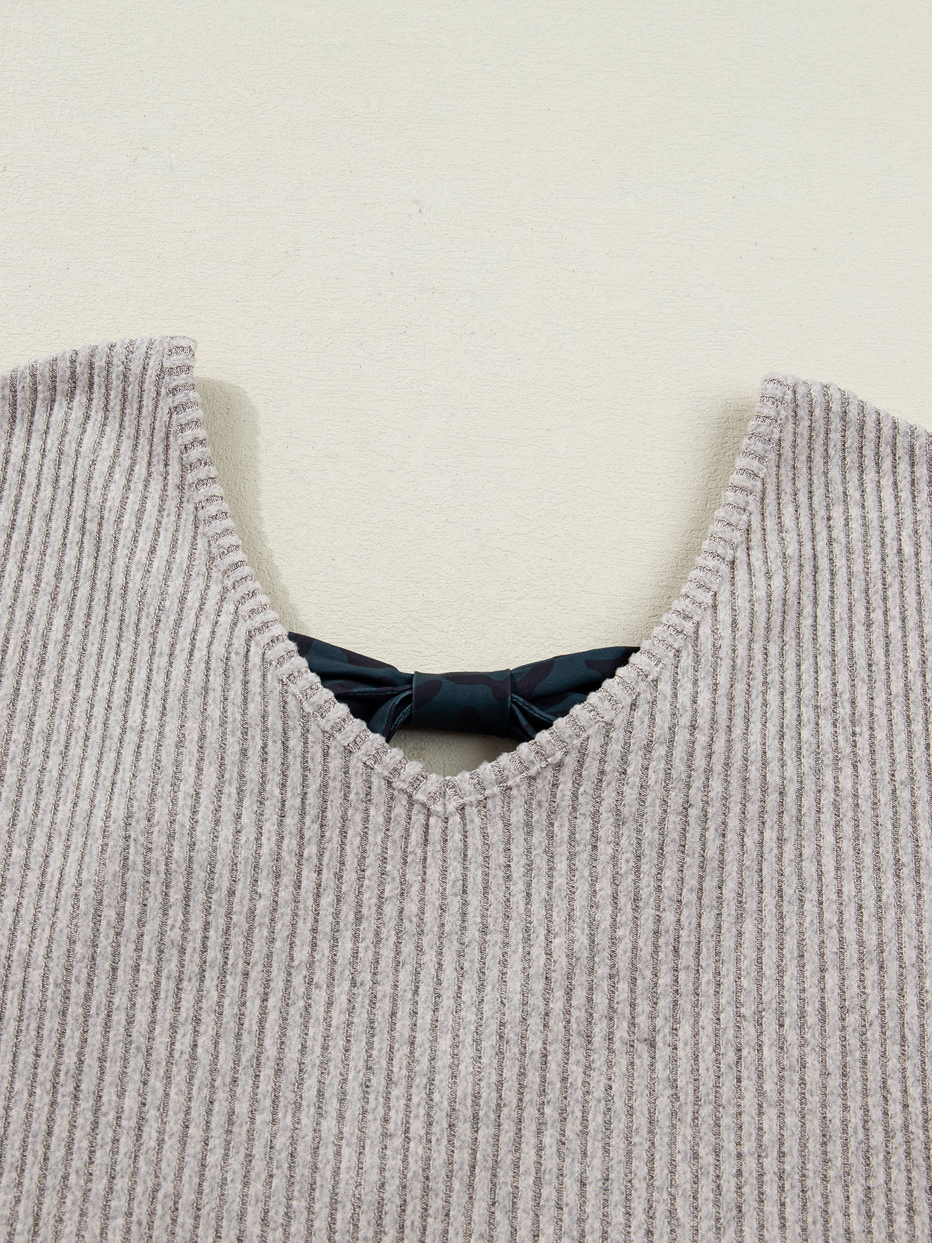 Ribbed V Neck Contrast Ribbon Bow Back Drop Shoulder Long Sleeve Top