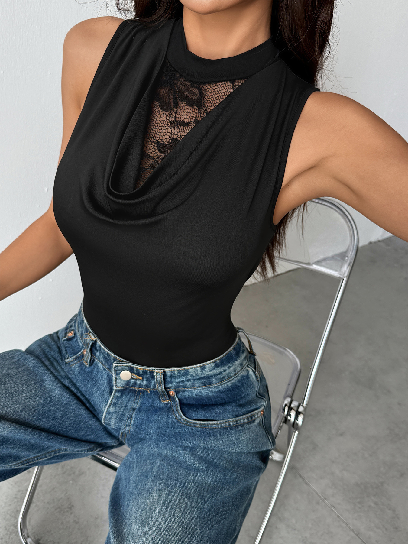 Lace Panel Cowl Neck Sleeveless Bodysuit