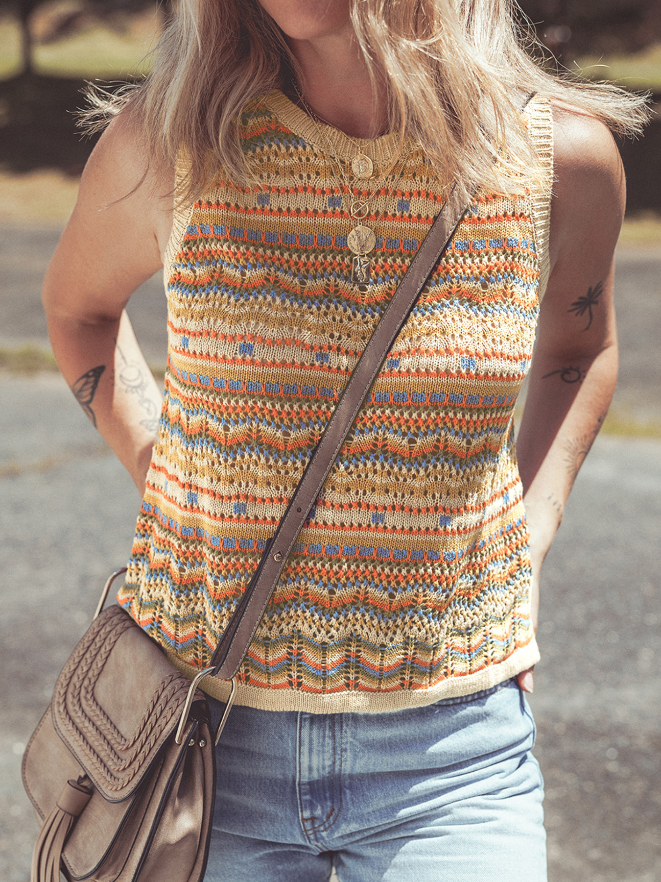 Stripe Eyelet Crochet Round Neck Sweater Vest