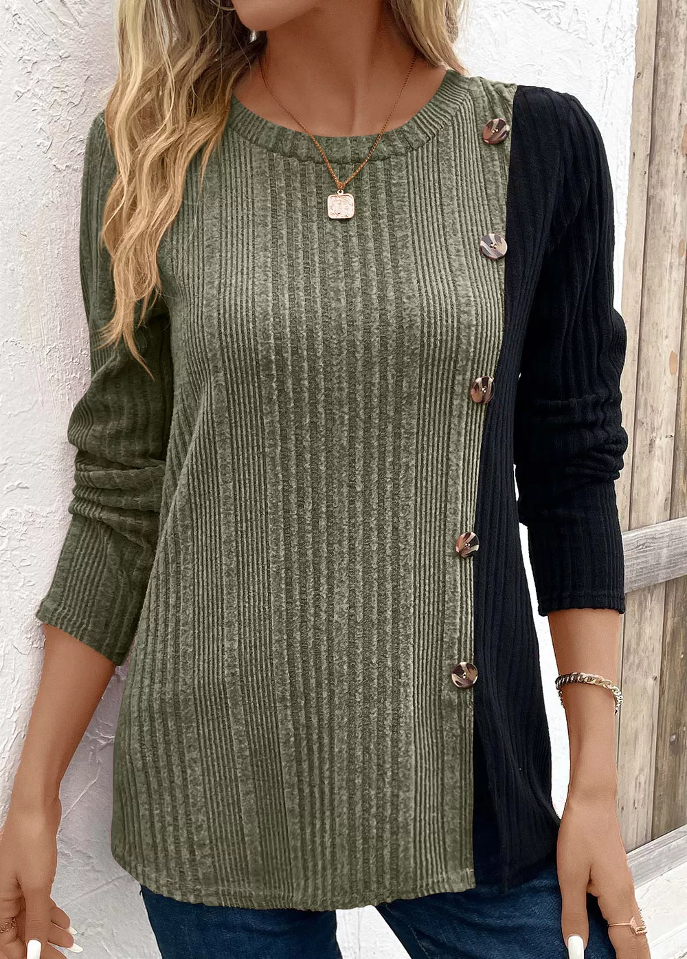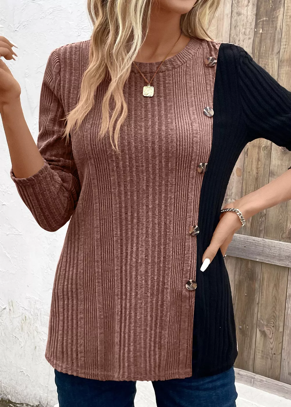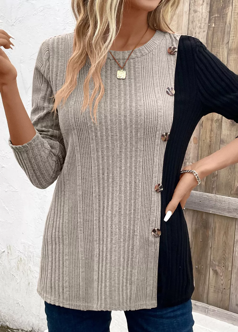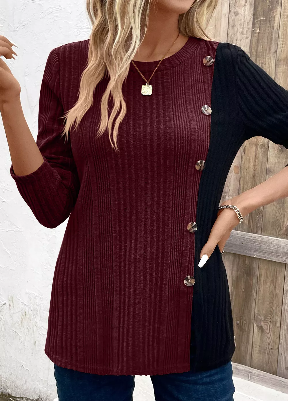 Color Block Ribbed Knit Decor Button T-Shirt