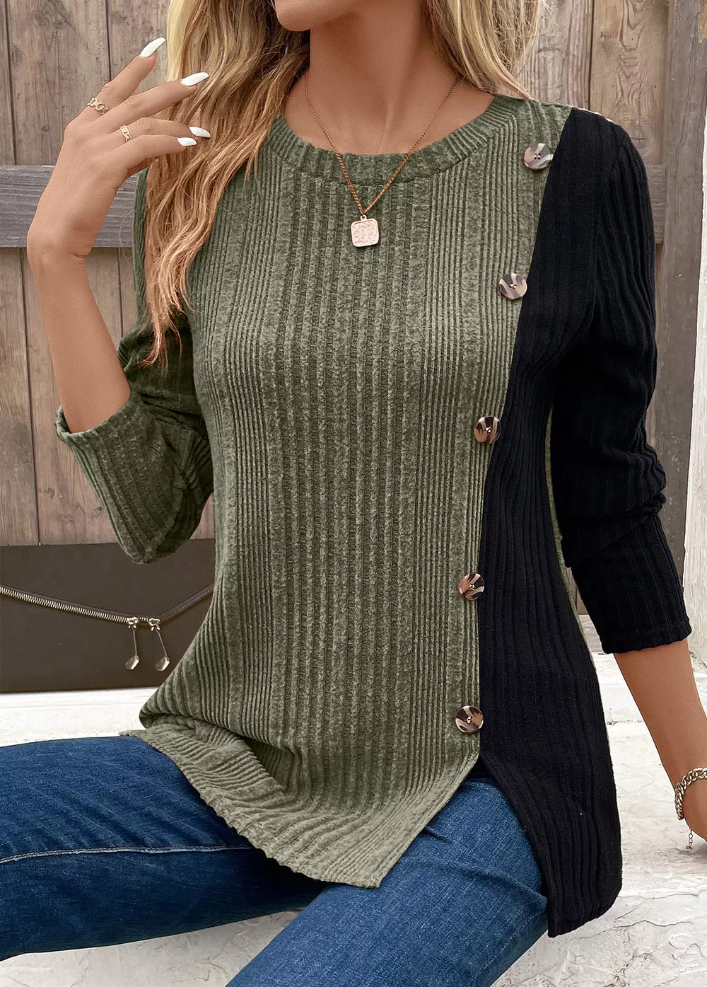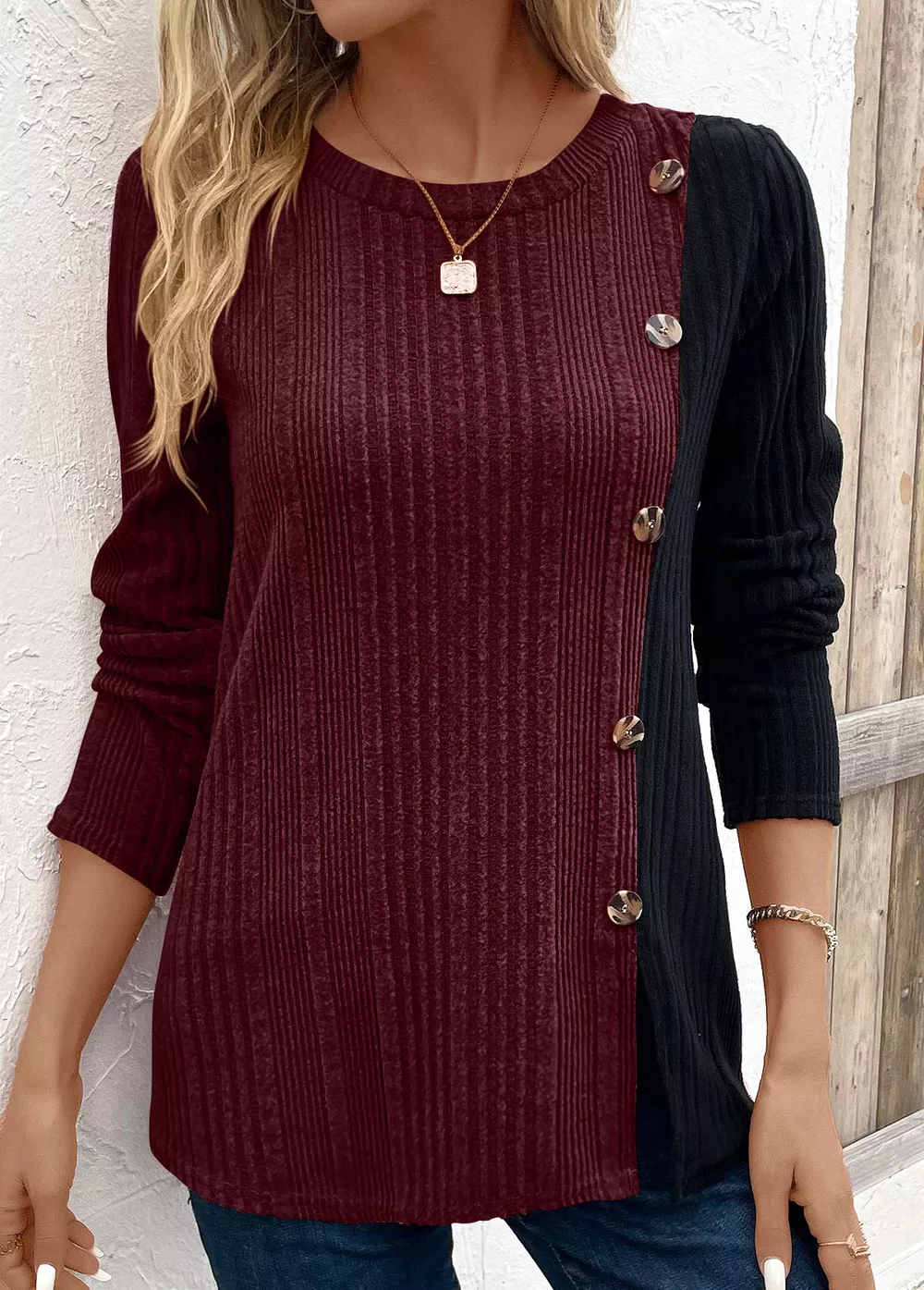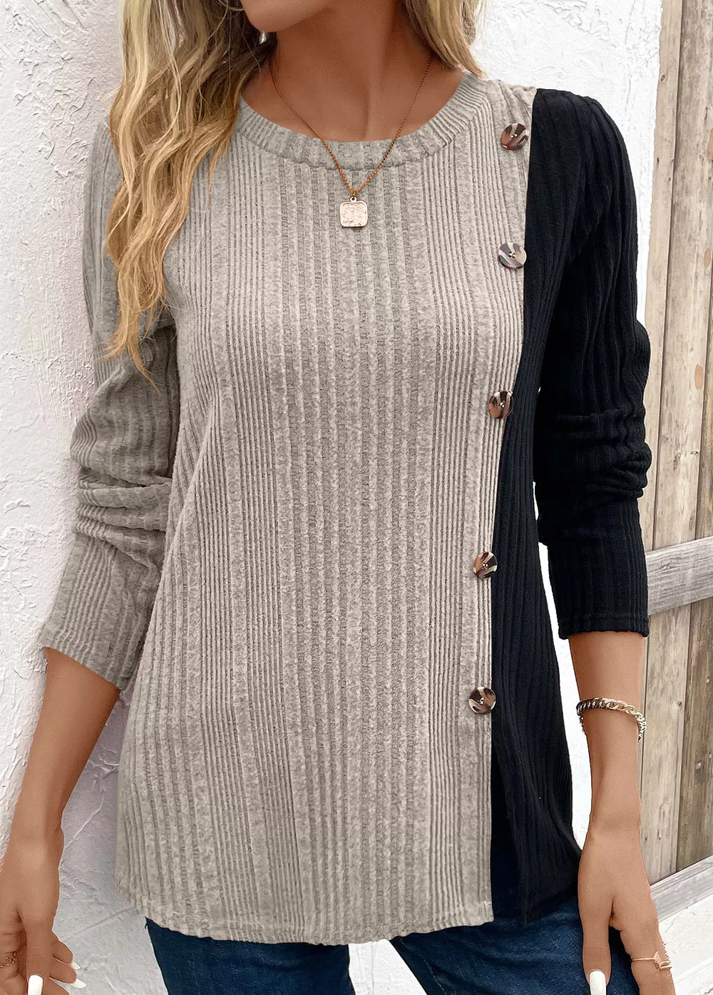 Color Block Ribbed Knit Decor Button T-Shirt