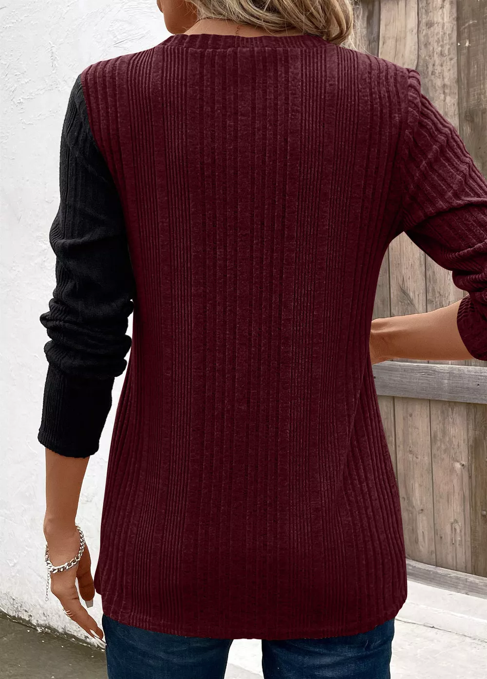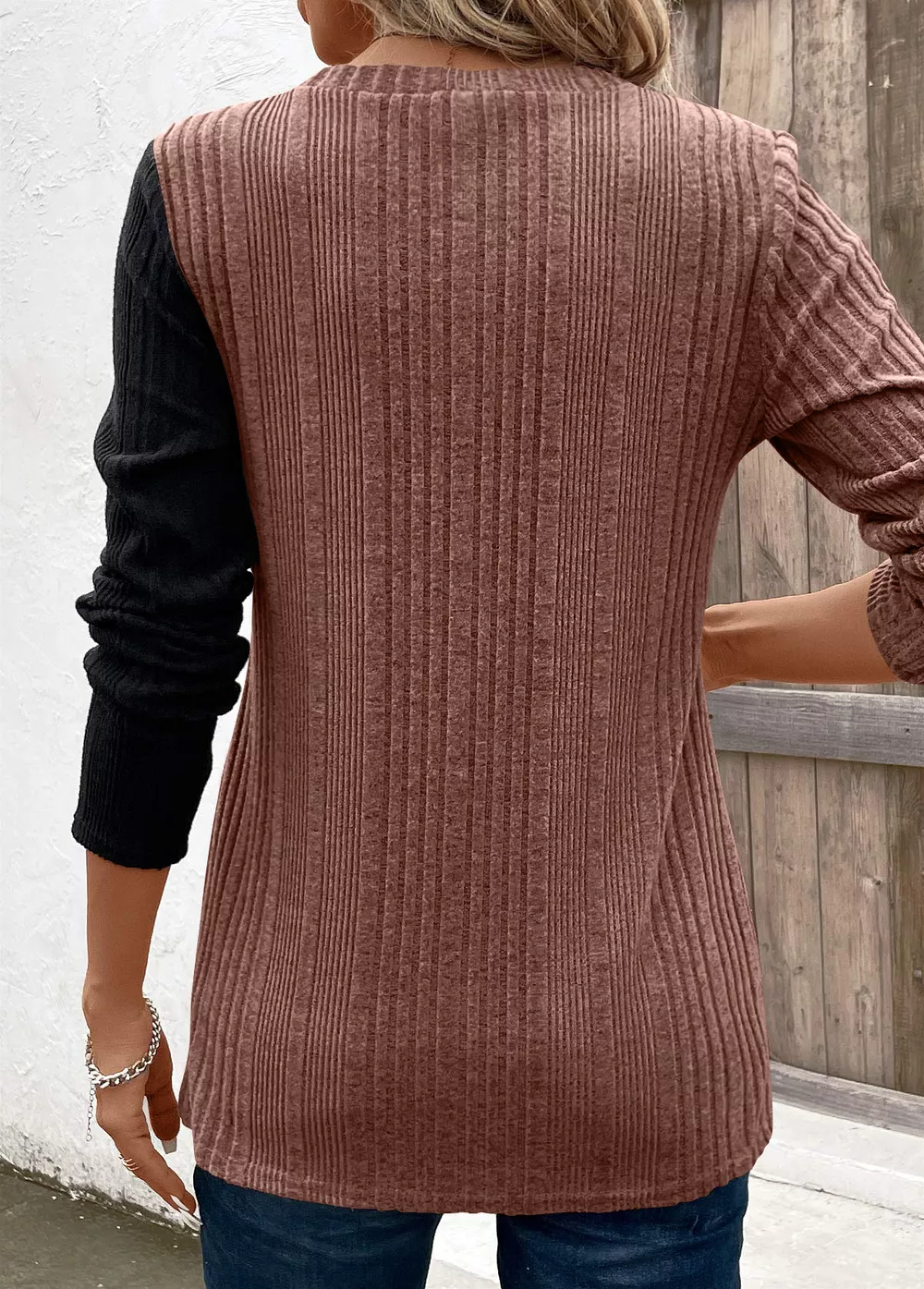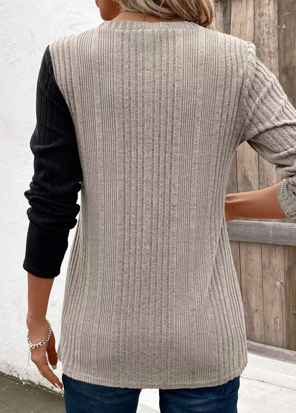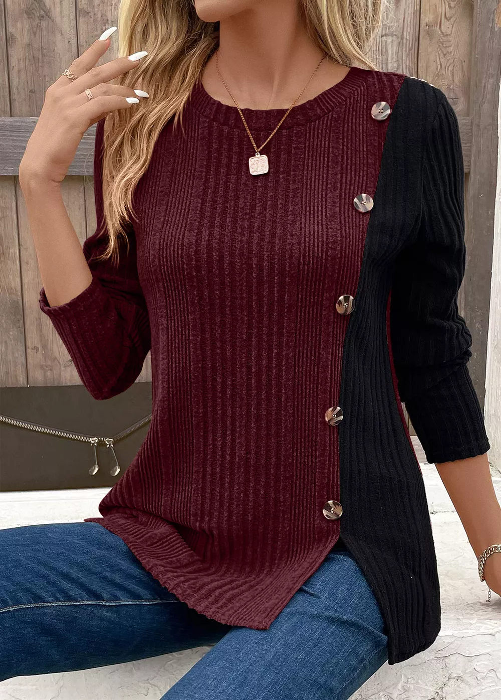 Color Block Ribbed Knit Decor Button T-Shirt