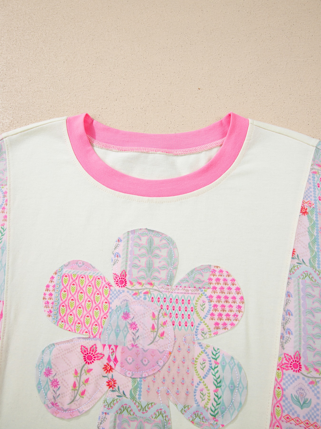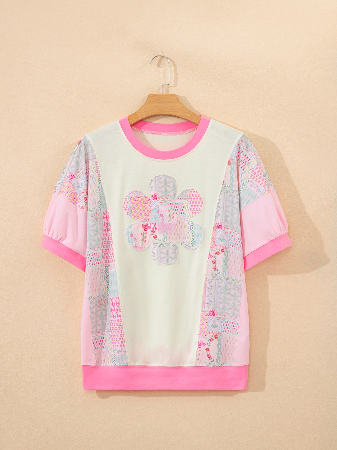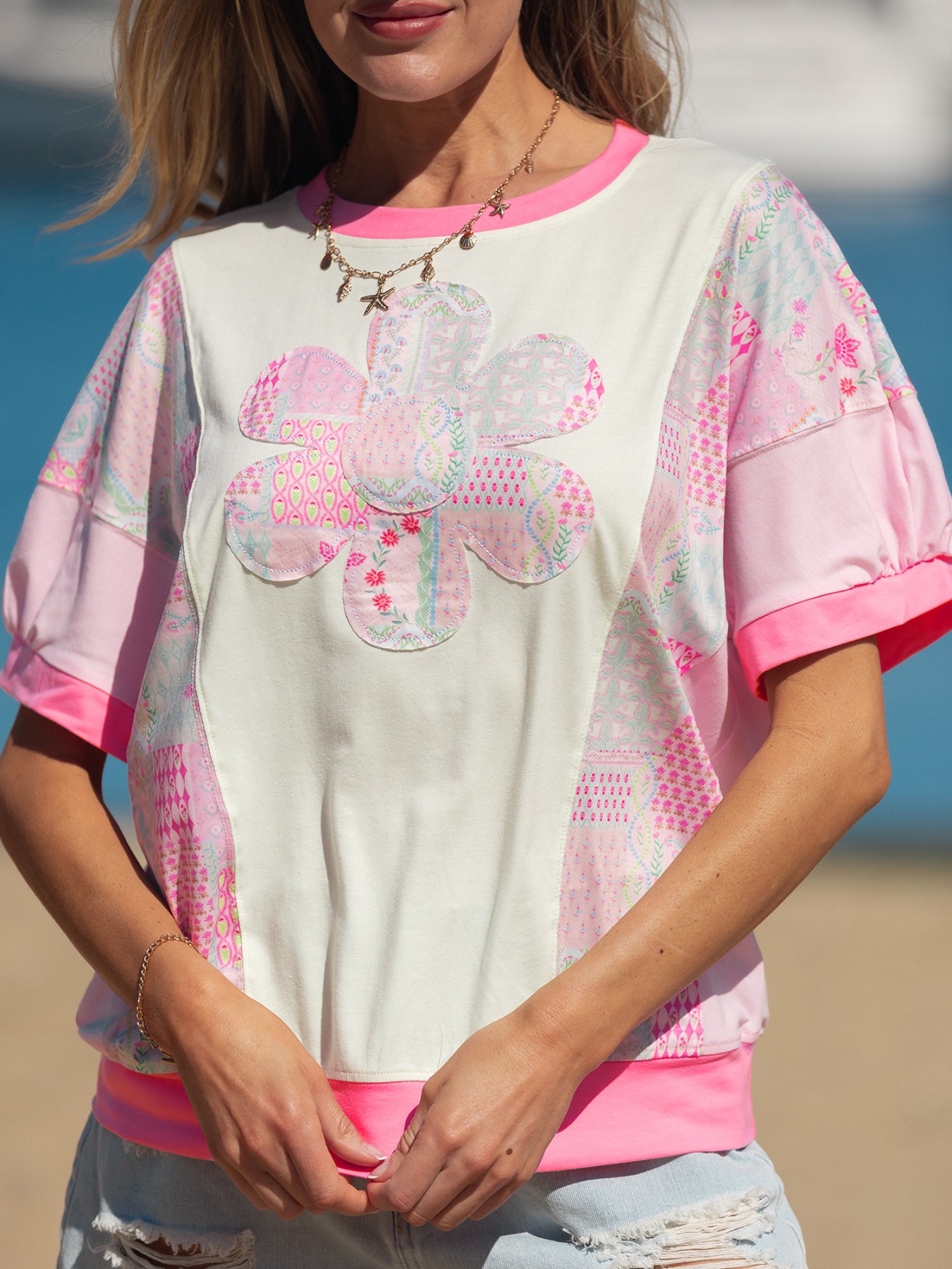 Color Block Floral Patchwork Big Flower Accent Relaxed Top