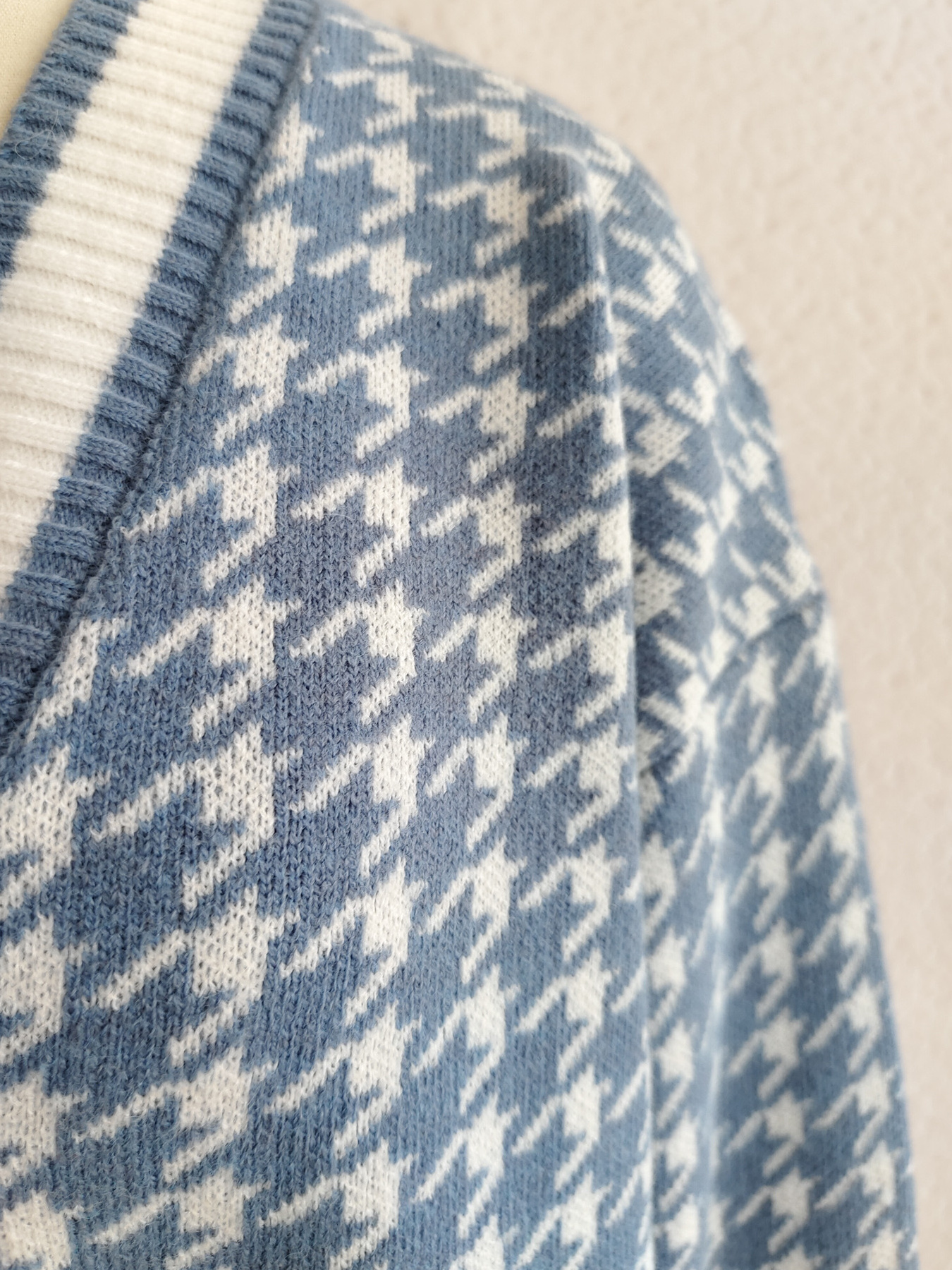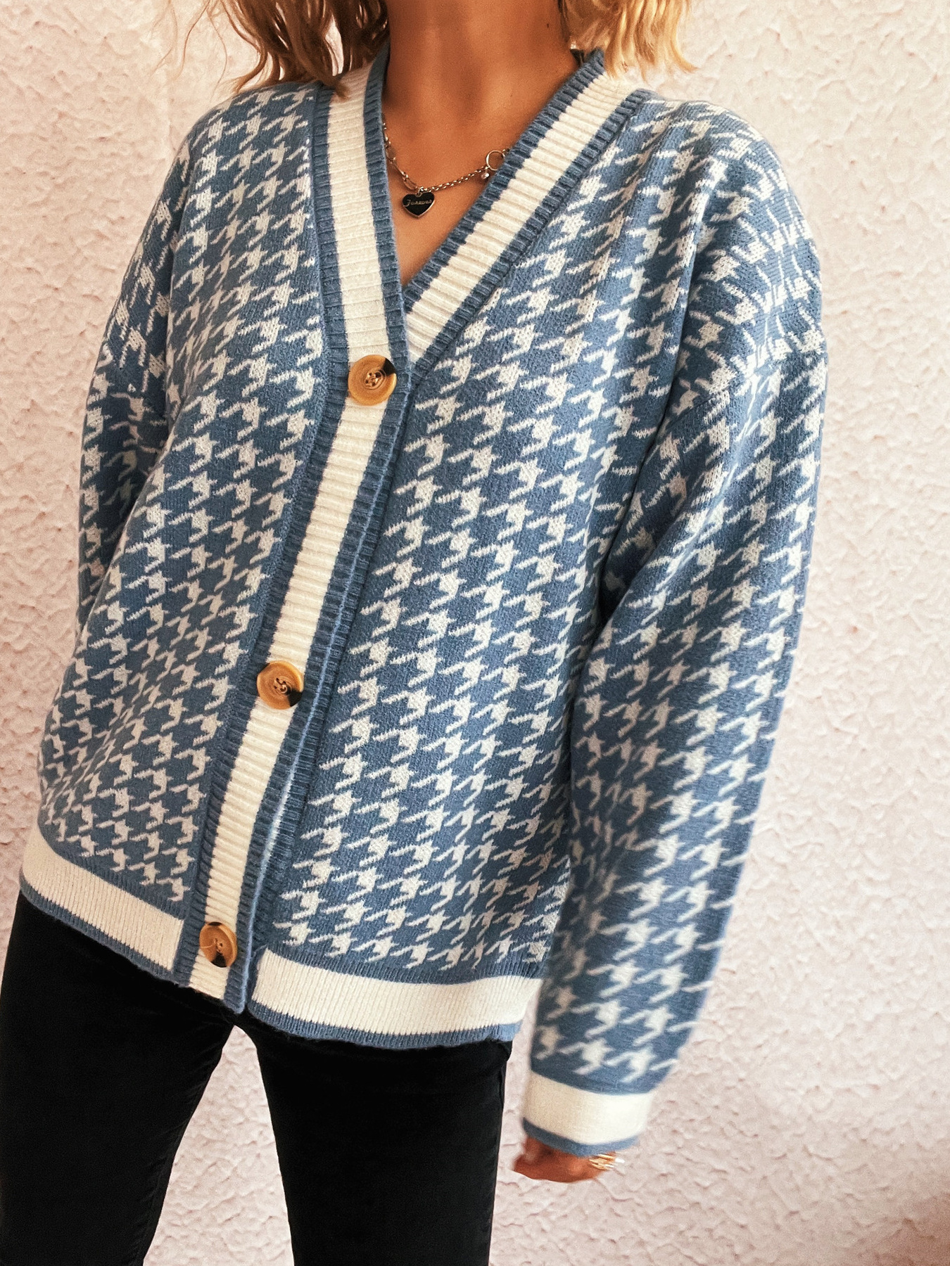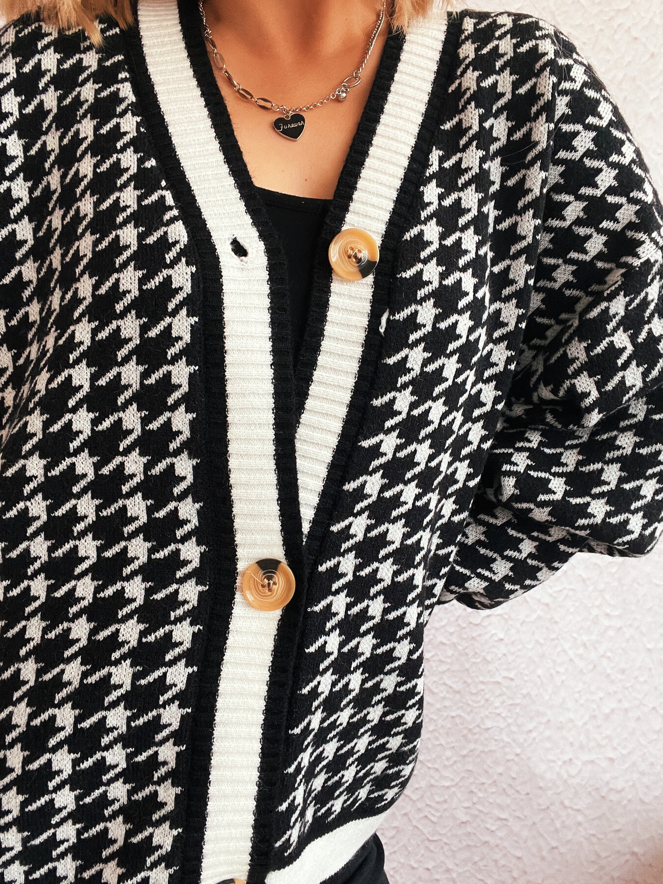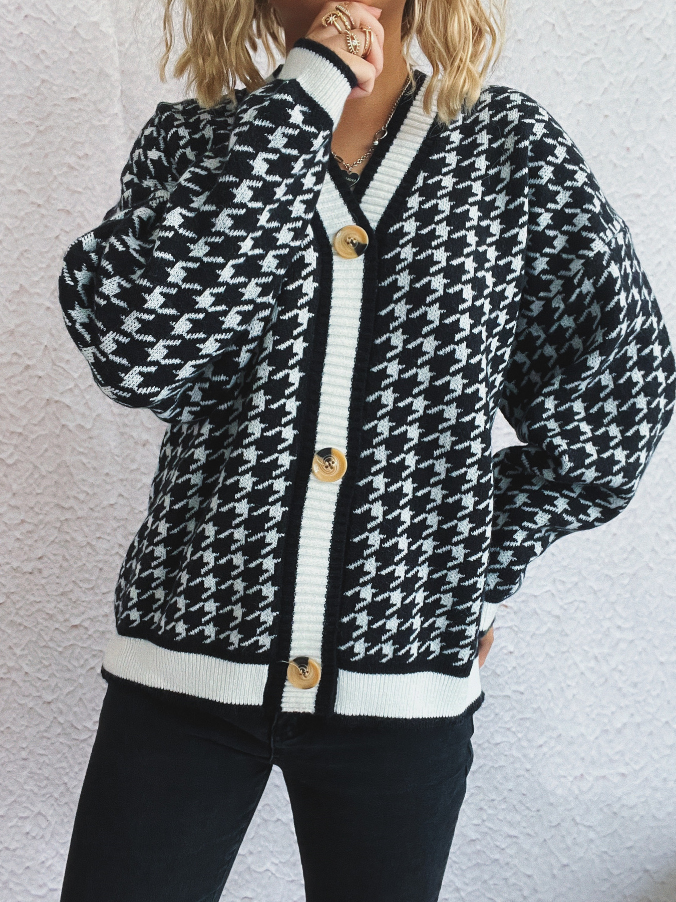 Houndstooth Pattern V-Neck Button-Up Cardigan