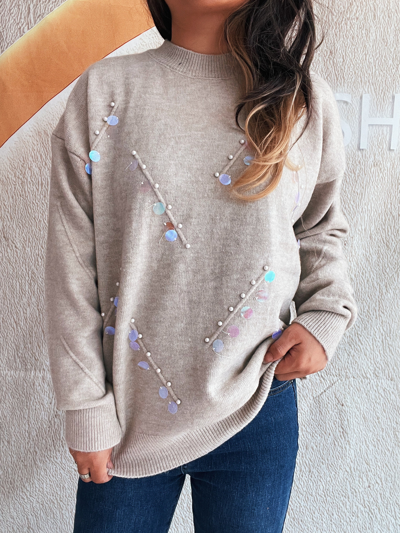 Sequined Embellished Round Neck Sweater