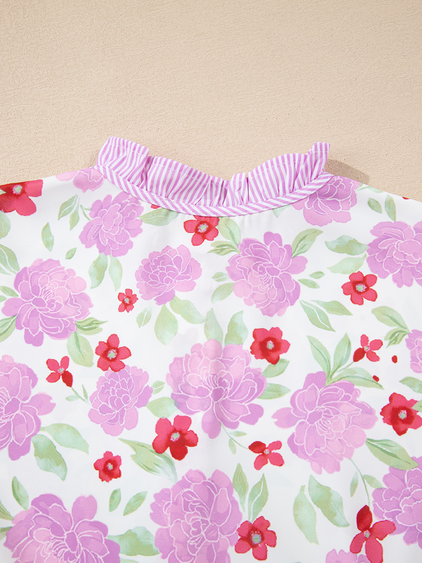 Floral Print Striped Trim Frilled Neck 3/4 Sleeve Flared Mini Dress
