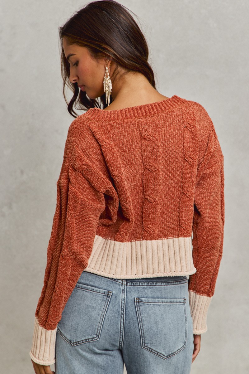 So Me Chenille Cable Knit V Neck Contrast Cropped Sweater