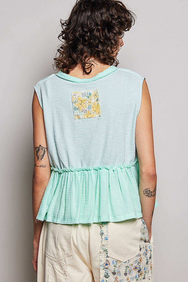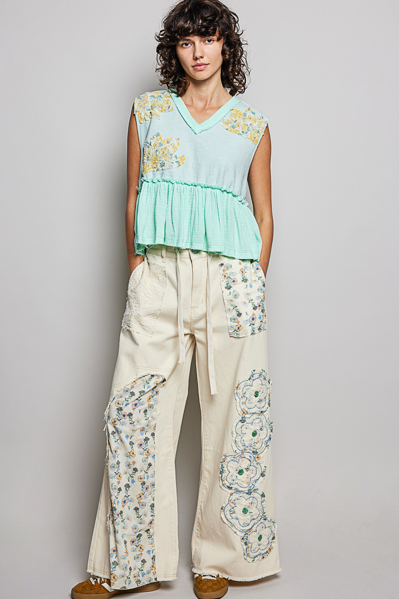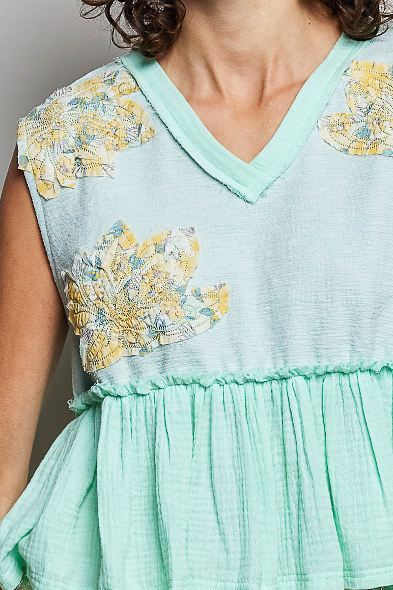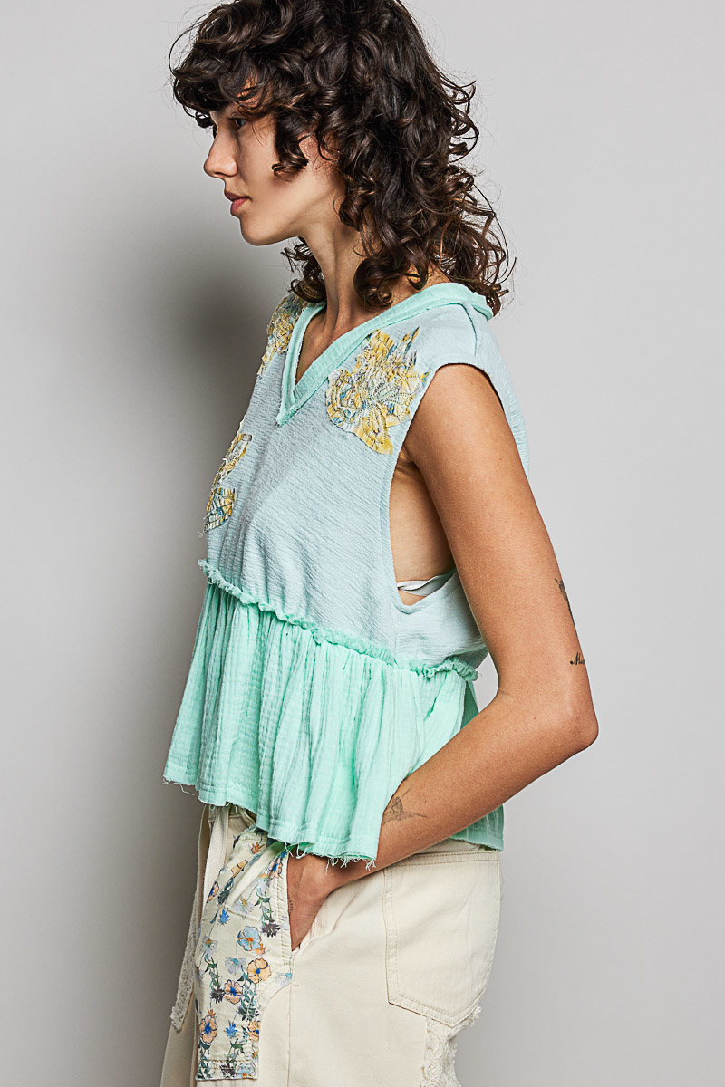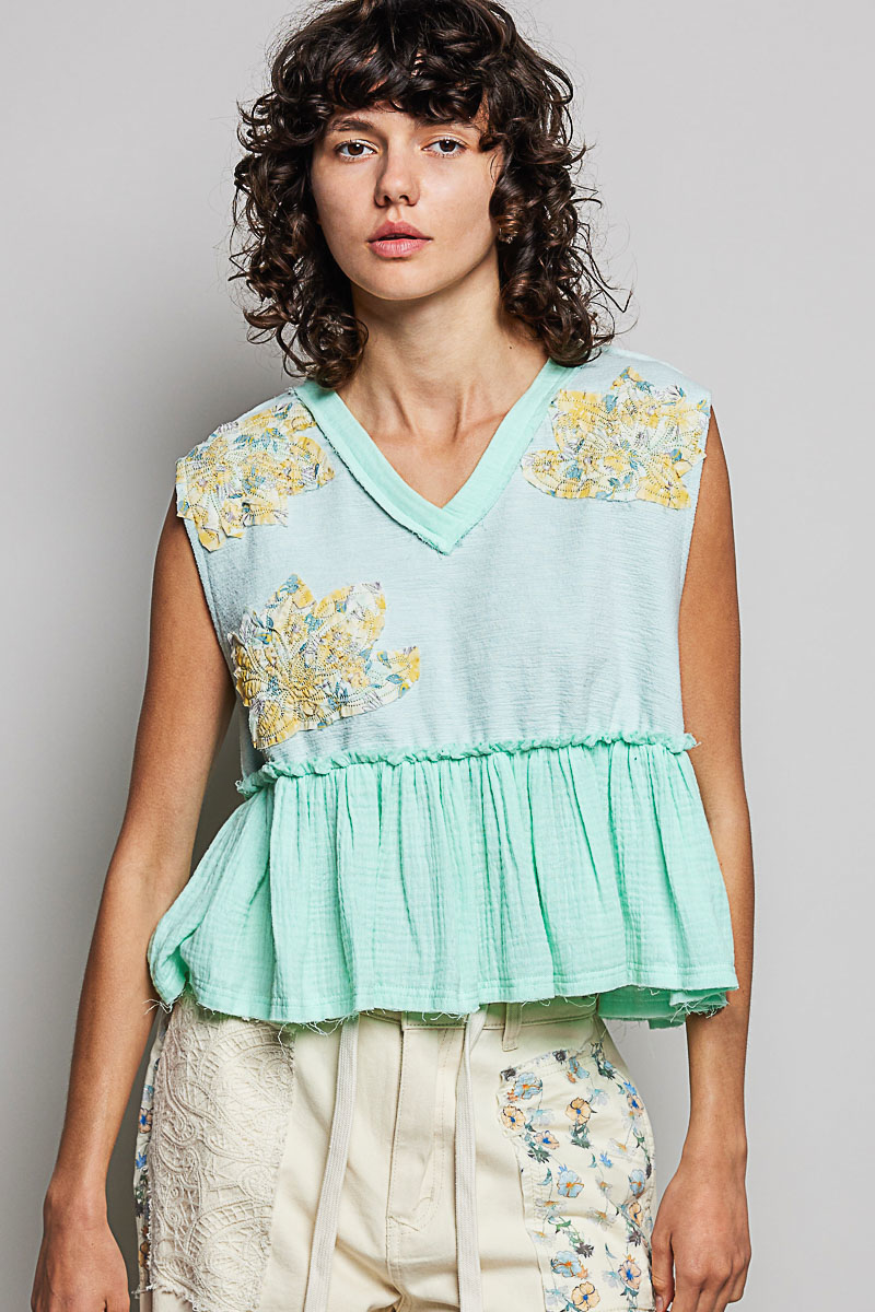 Pol Floral Patch Ruffled Sleeveless Top With Raw Edge Detail