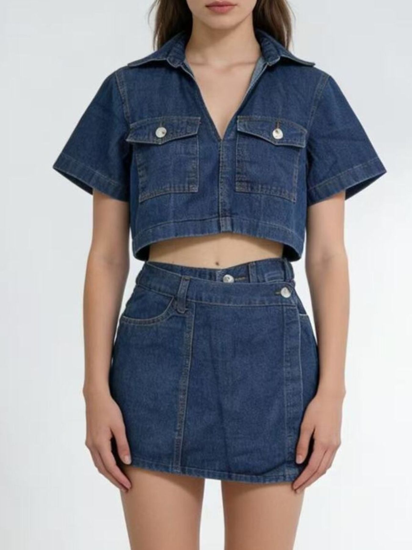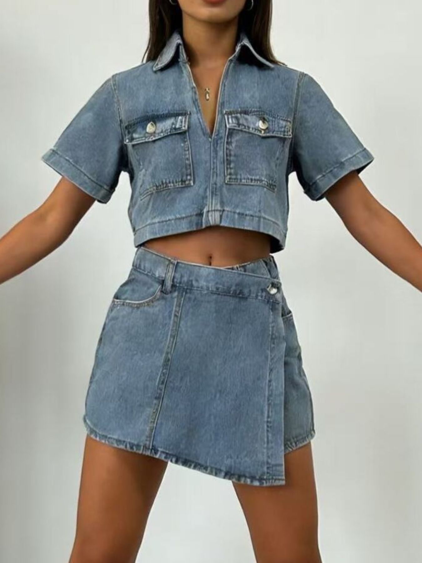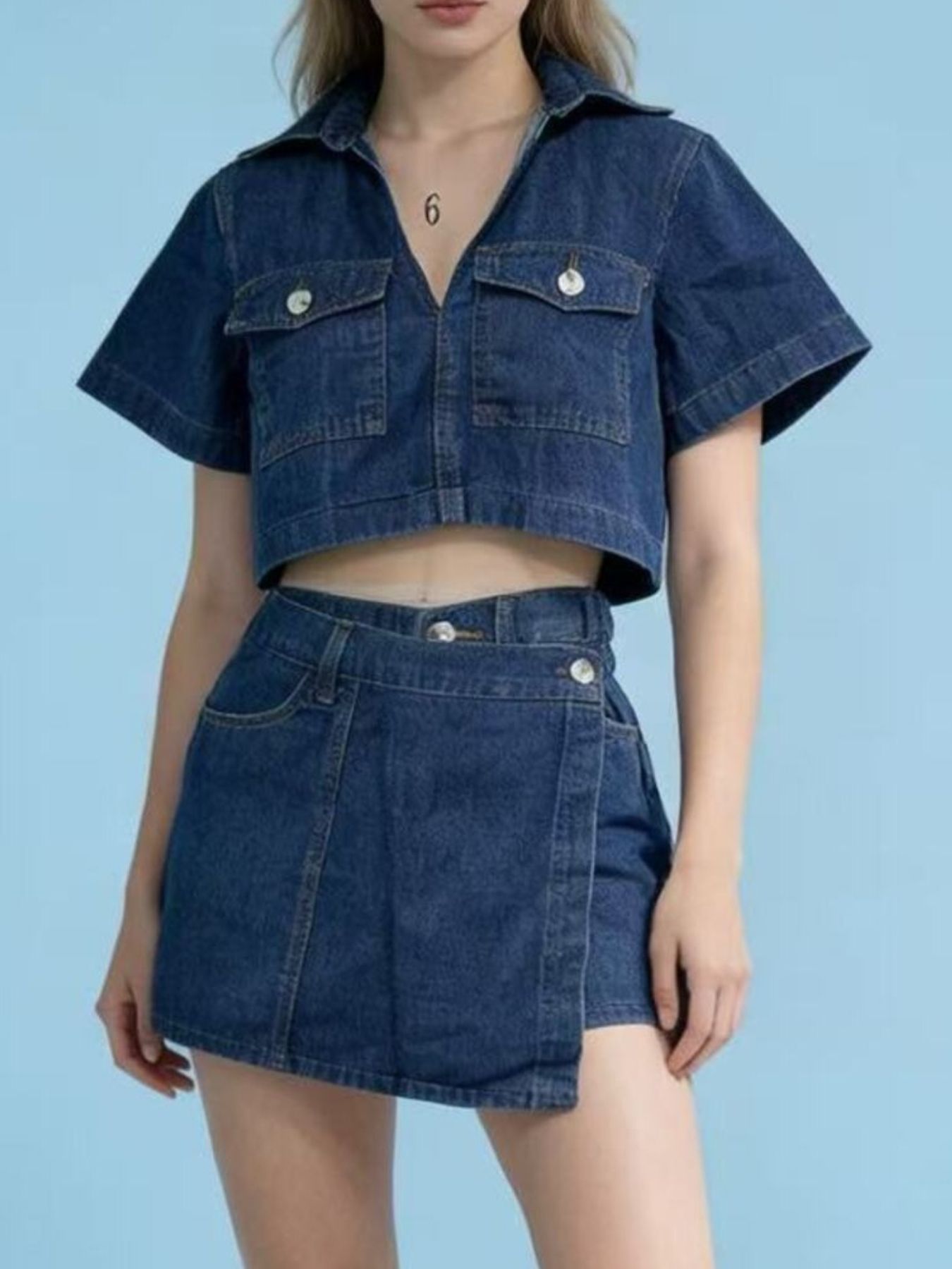 Short Sleeve Cropped Top And Skort Denim Set