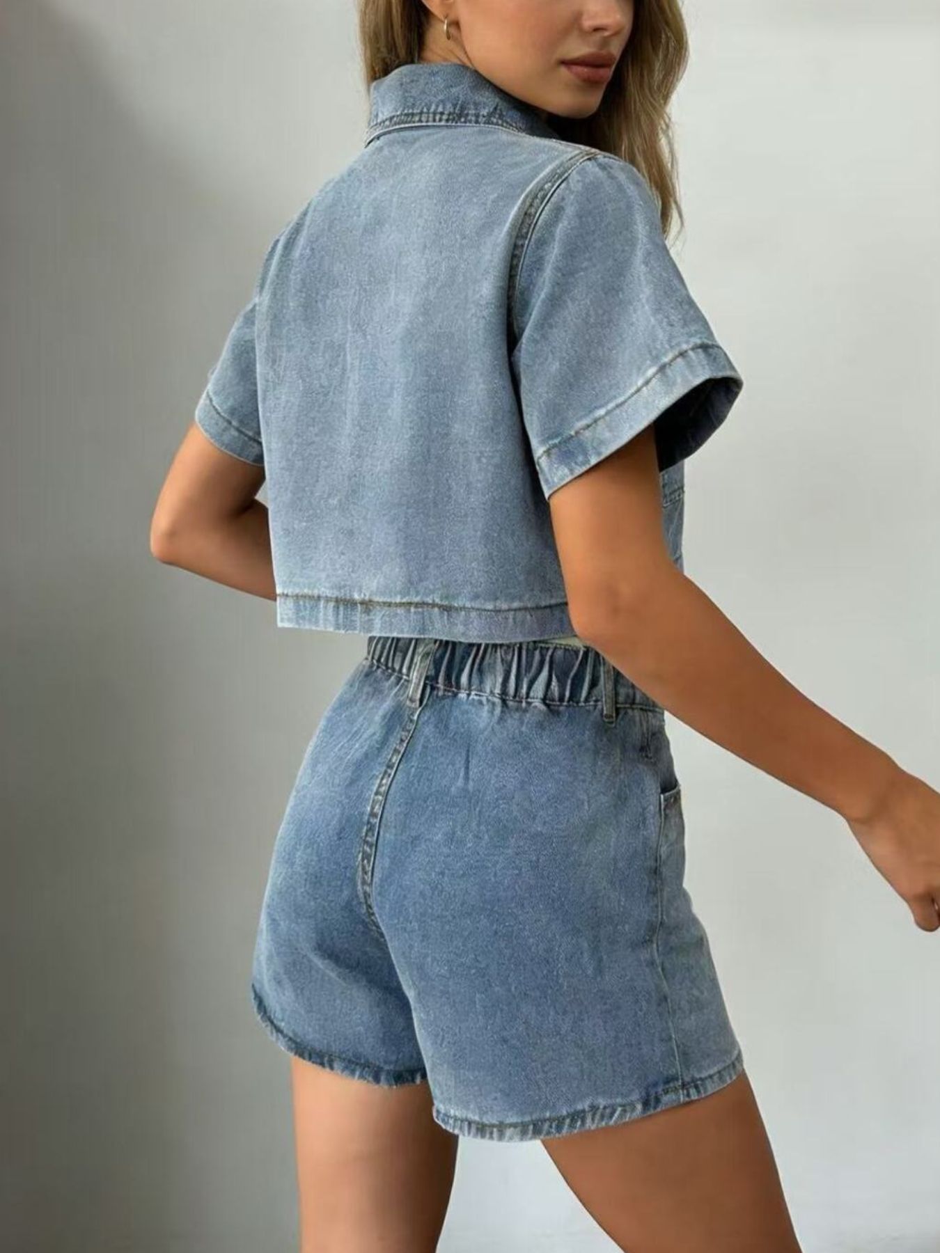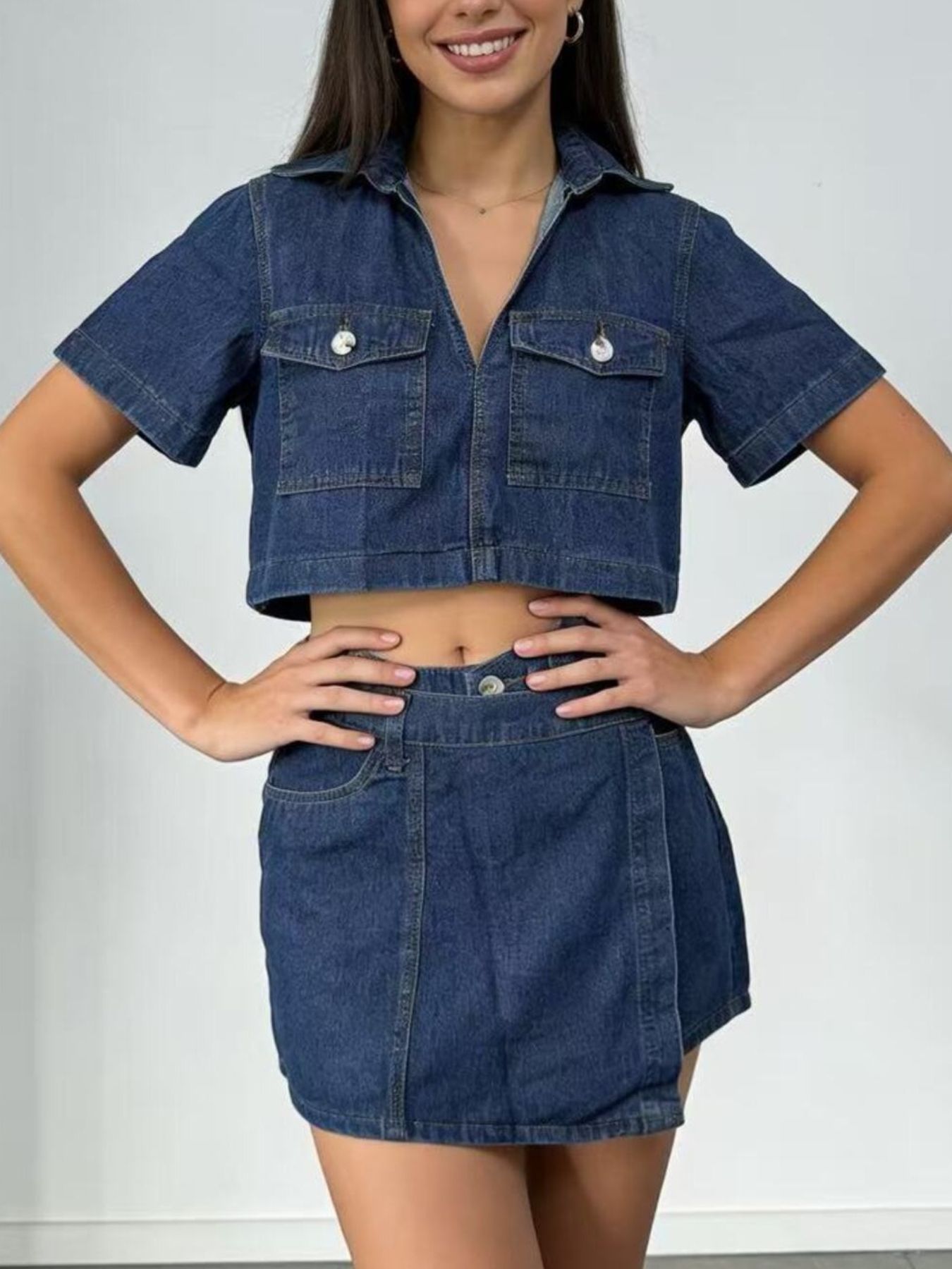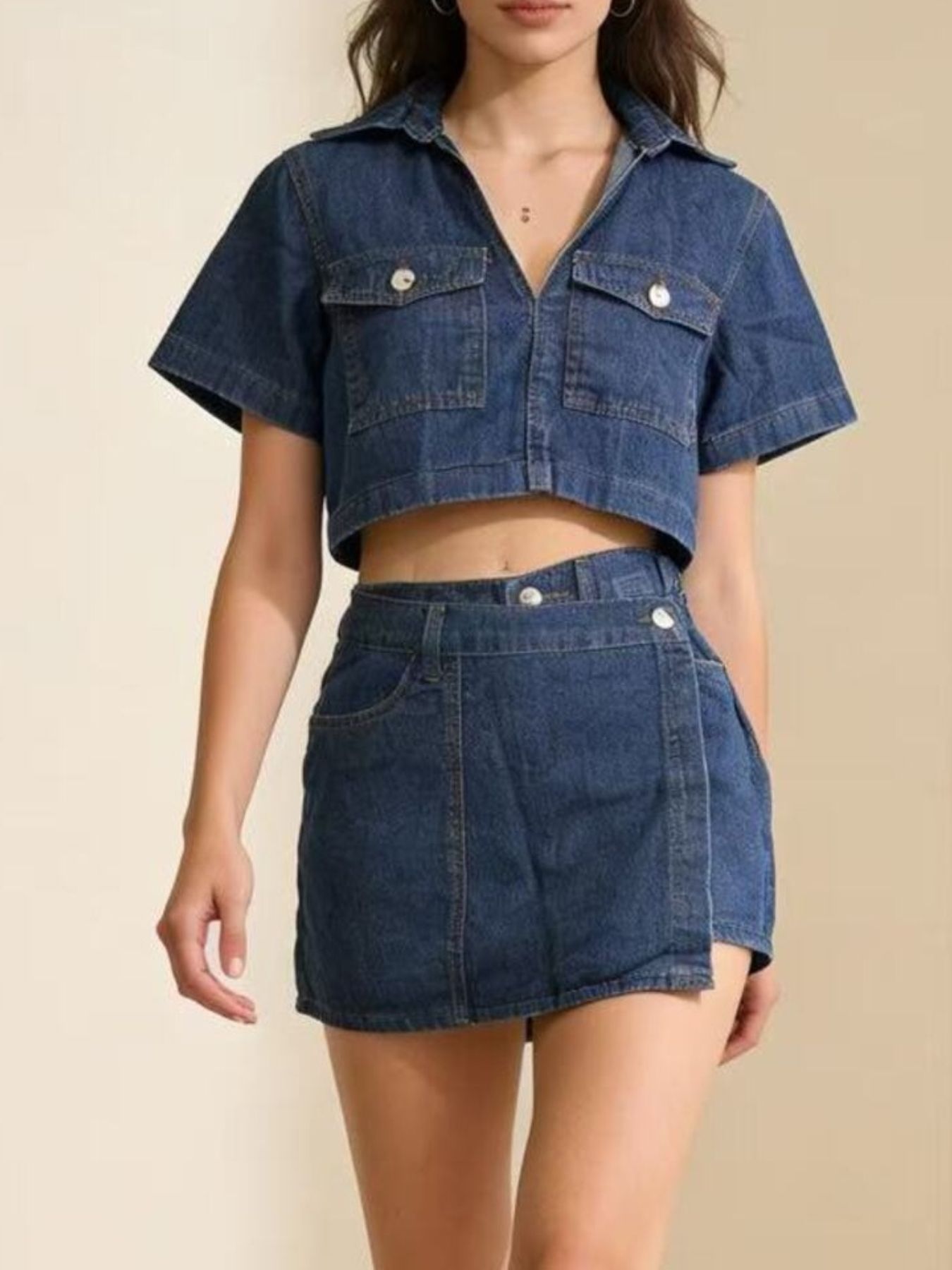 Short Sleeve Cropped Top And Skort Denim Set