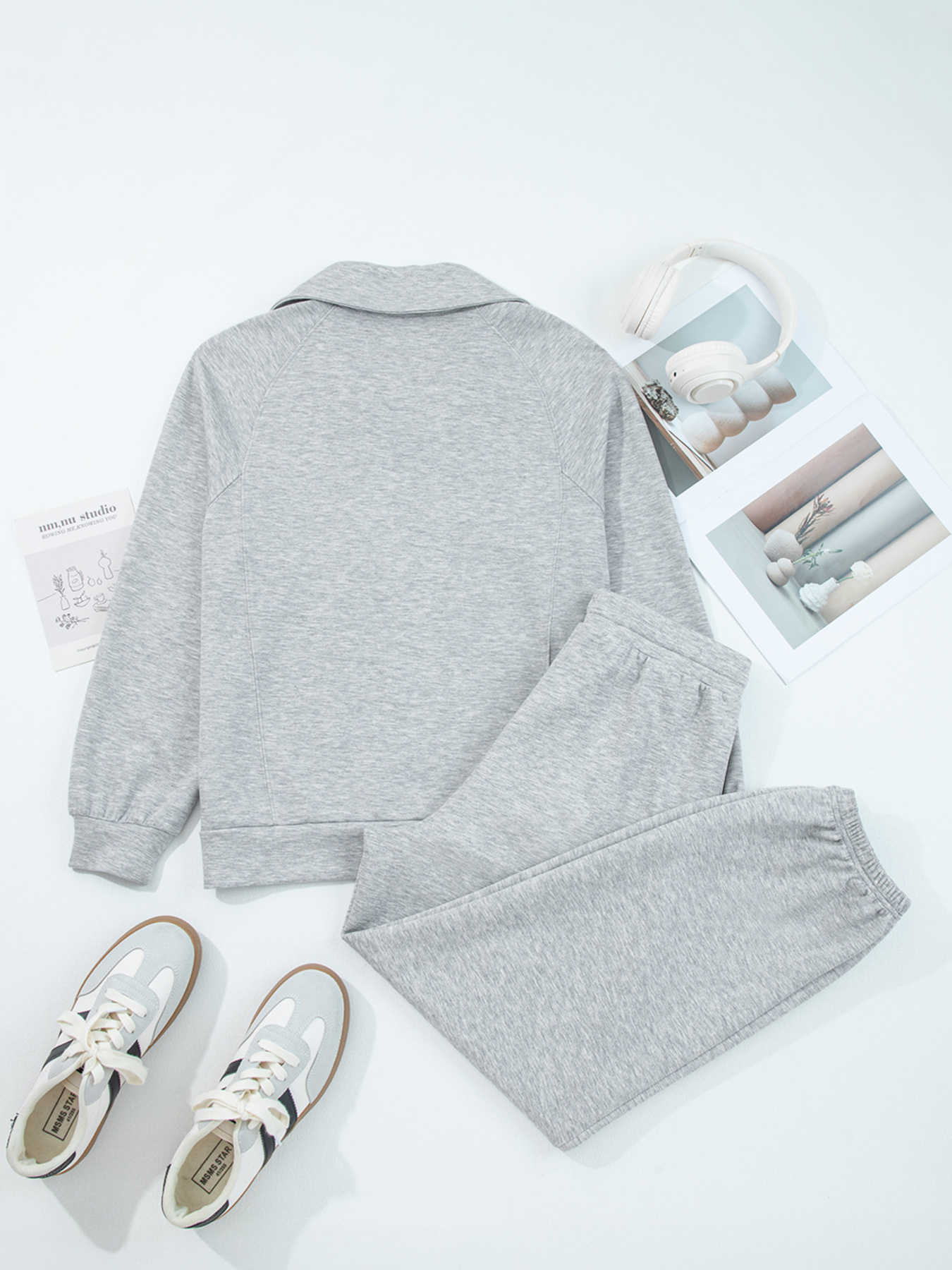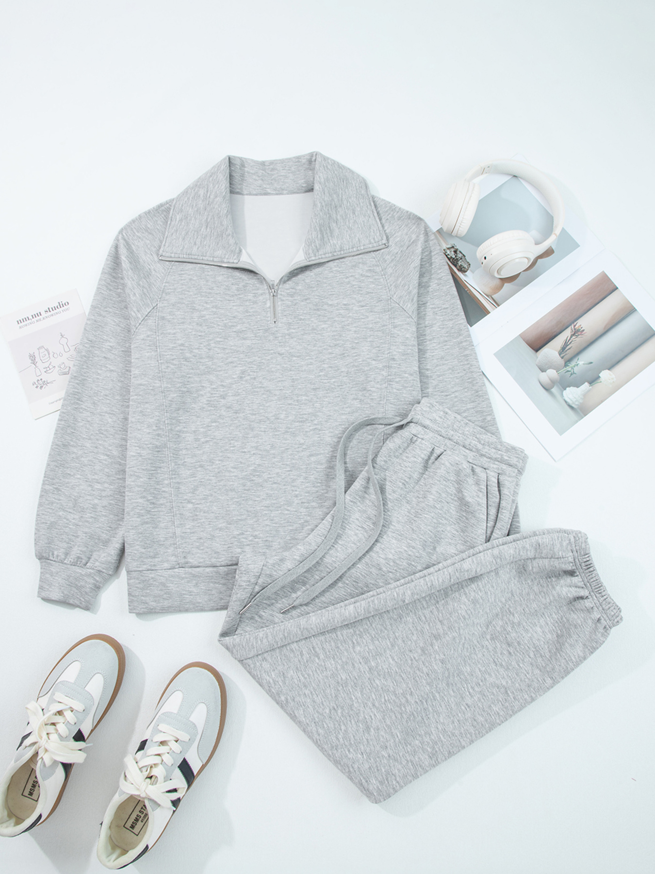 Zip Collar Long Sleeve Top And Drawstring Pants Set